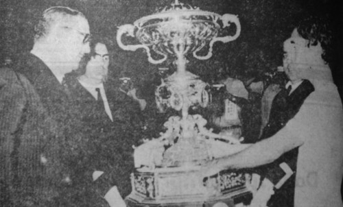 Manolín Bueno recibe la copa de campeón para el Real Madrid en 1970